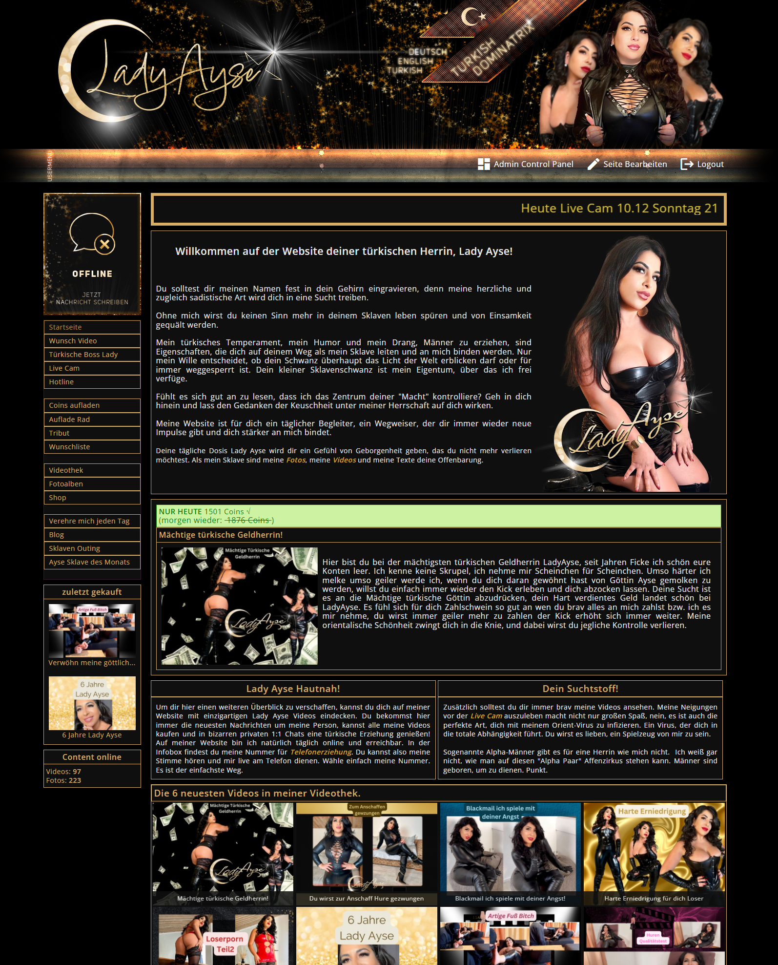 Ayse schreibt über sich: Mein türkisches Temperament, mein Humor und mein Drang, Männer zu erziehen, sind Eigenschaften, die dich auf deinem Weg als mein Sklave leiten und an mich binden werden. Nur mein Wille entscheidet, ob dein Schwanz überhaupt das Licht der Welt erblicken darf oder für immer weggesperrt ist. Dein kleiner Sklavenschwanz ist mein Eigentum, über das ich frei verfüge.